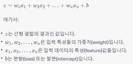 선형 결합의 결과값이 제트고, 더블유는 입력 특성들의 가중치 웨이트 값이다