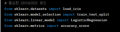 셋째줄은 사이킷 라이브러리에서 선형 모델로 로지스틱 회귀 모델을 불러온다는 것이다.